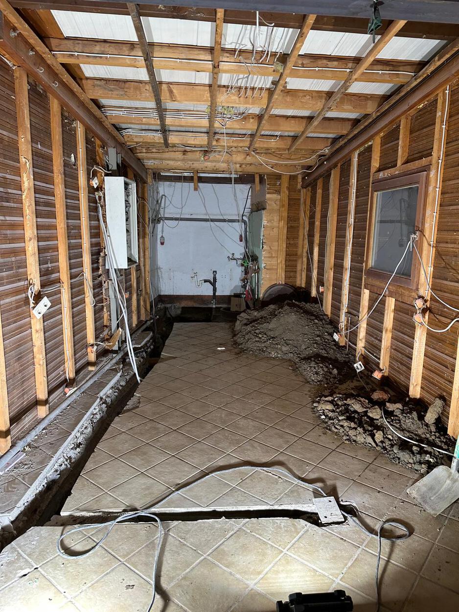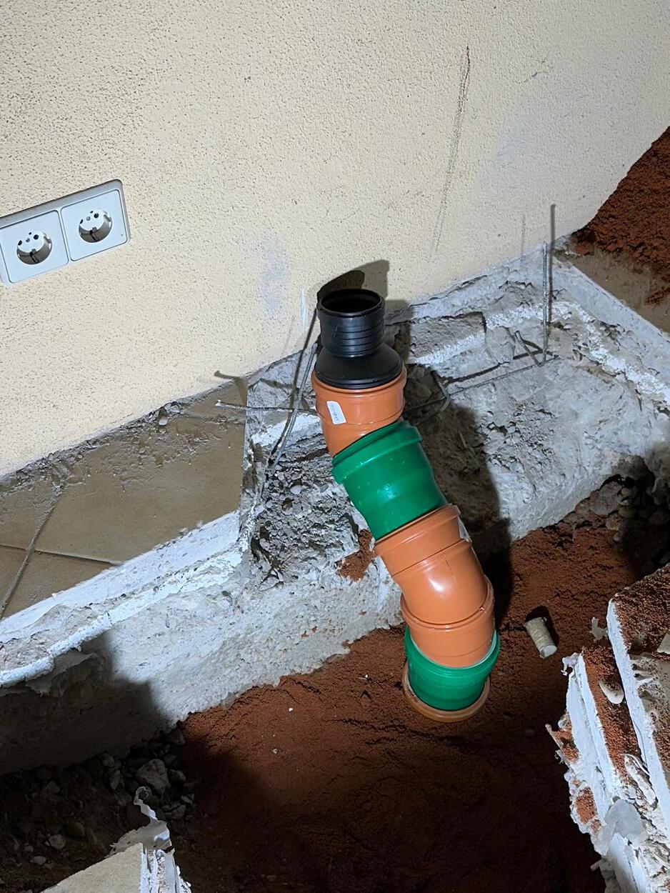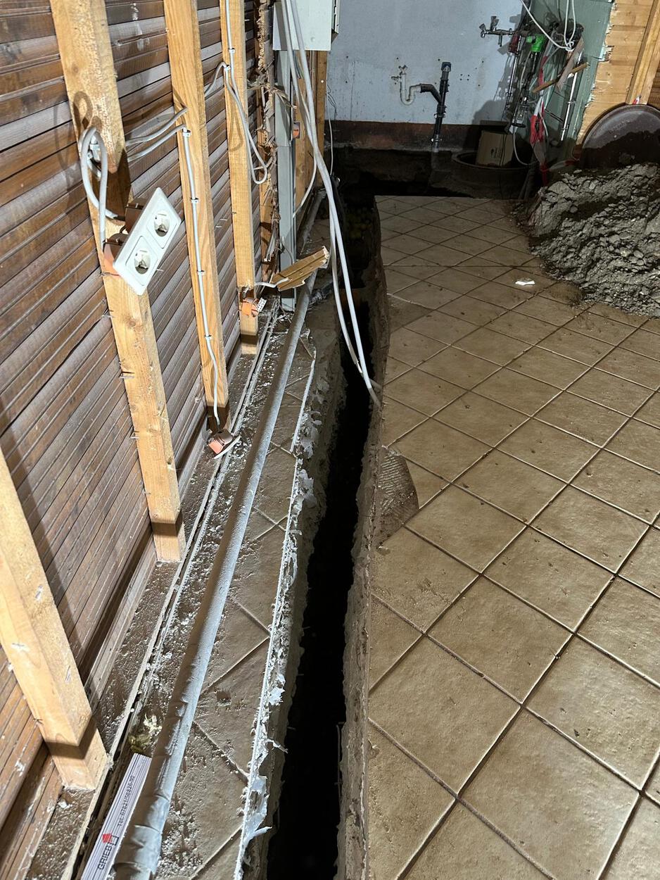 Das Fundament zwischen der alten Küche und dem Spülmaschinenraum ist jetzt erfolgreich „untertunnelt“. Der Graben ist – bis auf den Bereich am Stahlträger – durchgehend über 80 cm tief. Auch das Abwasser für die neue Küche ist bereits verlegt.